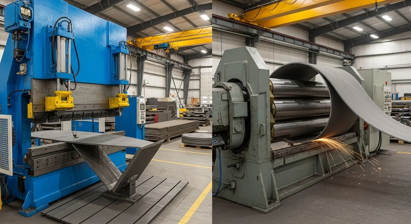 تنتج فرامل الضغط انحناءات زاوية في صفيحة سميكة — الحواف, ملفات تعريف الصناديق, هياكل الهيكل, وأشكال الأقواس. تنتج آلة درفلة الألواح أشكالا منحنية وأسطوانية — مثل قشور الدلاء, أقسام الذراع المنحنية, وأوزان أسطوانية موازنة. عادة ما يحتاج تصنيع آلات البناء إلى كلا النوعين من الآلات لأن المكونات المختلفة تتطلب هندسة تشكيل مختلفة.