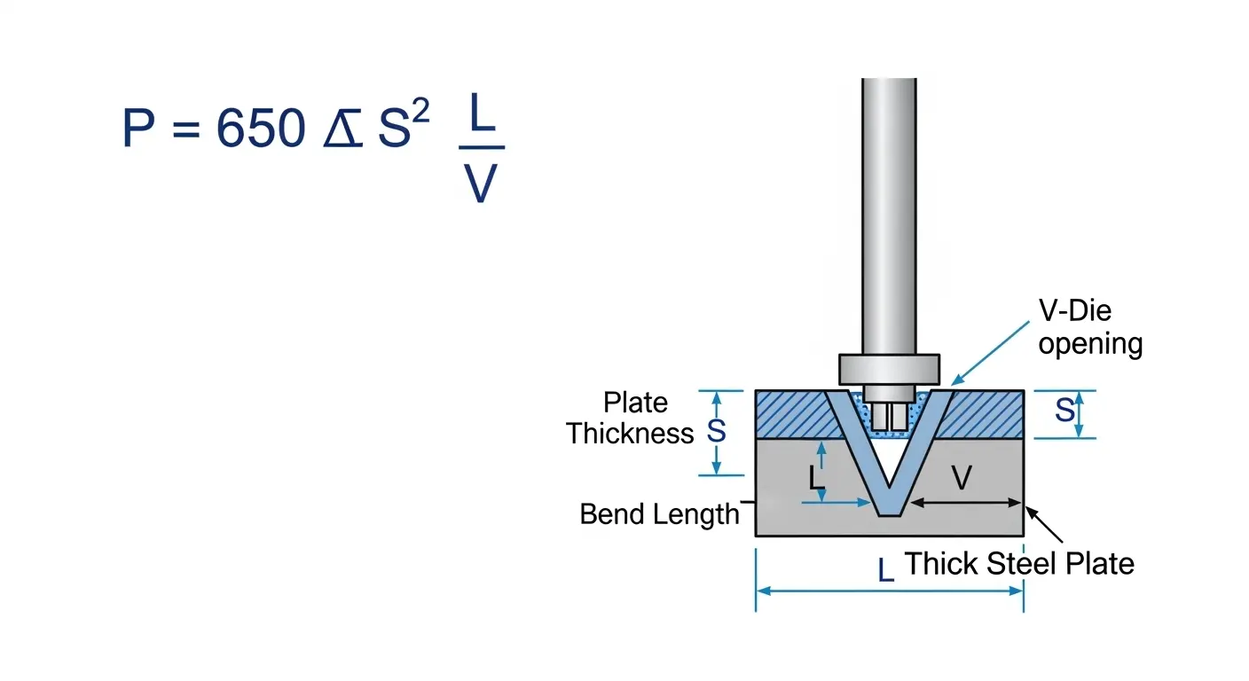 حيث: S = سمك الصفيحة (المليمتر), L = طول الانحناء (m), V = عرض فتحة الشريحة V (المليمتر).